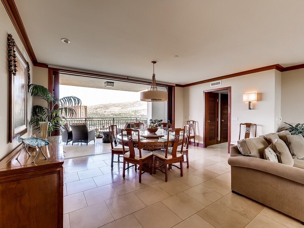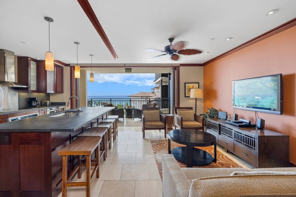 ゆったりと設計された心地良い室内は、いずれもハワイの伝統的なライフスタイルを踏襲し、涼しい貿易風が家の中を通る、開放的な雰囲気のレイアウトとなっています。フロアから天井まで届く開放的な窓からは、雄大な景色が眺められ、スライドドアを開けると風の気持ち良い、ゆったりとしたラナイへと続きます。屋内から屋外のラナイへと繋がる造りは、まさに南国のライフスタイルといったところですね。