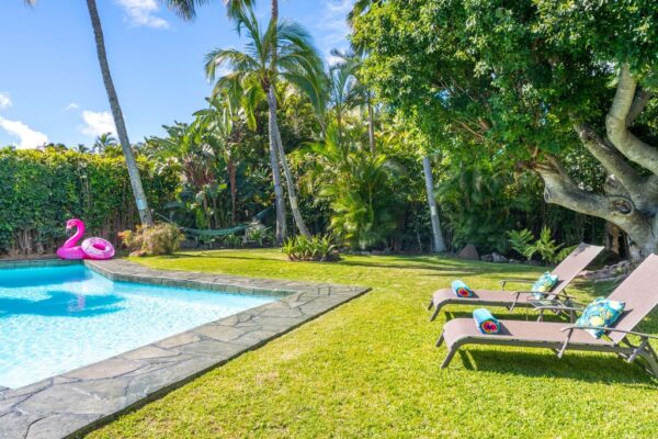 アイナハイナにちょこっと海に突き出た半島、ニウ・ペニンシュア。 プルメリアやブーゲンビリアなどの南国な花が咲き誇り、手入れの行き届いたお庭を持つ 豪邸が建ち並ぶ一角にある広いガーデンに大きなプール付きの邸宅。 ヤシの木のハンモックに揺られな...