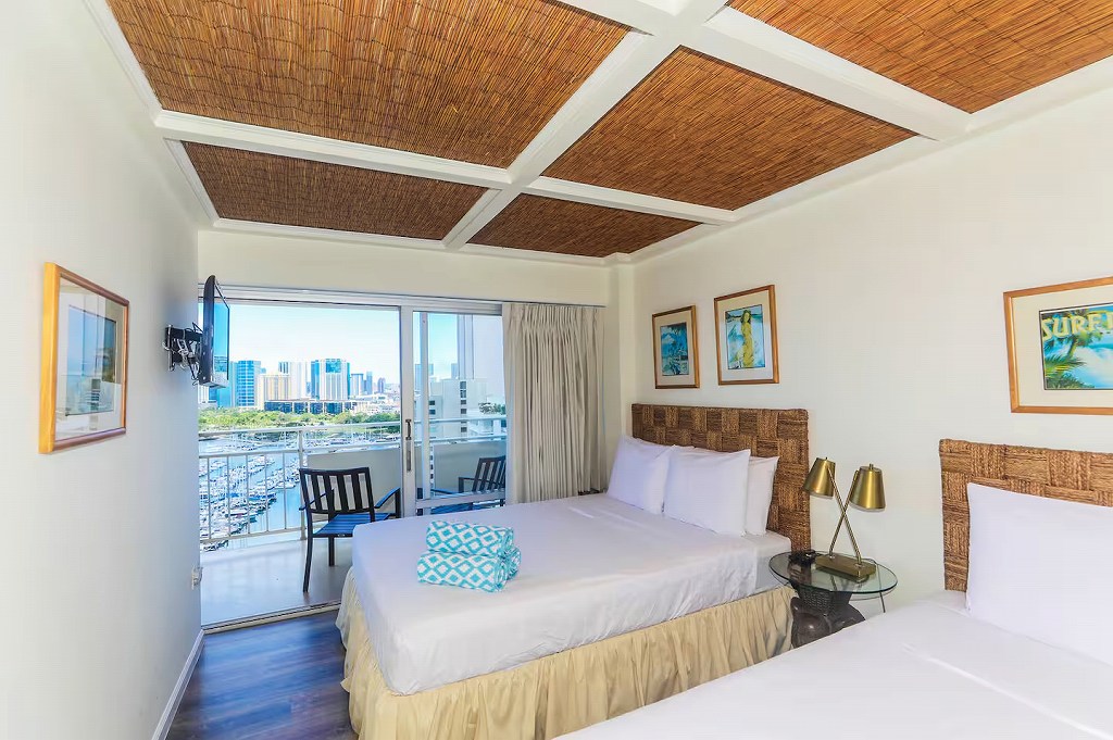 ワイキキの象徴的コンドミニアム、ビーチとヨットハーバーを望む抜群の立地のオーシャンフロントに建つイリカイ・ホテル。その18階にある2ベッドルーム・オーシャンビュー[18F-1]のユニットです。快適なリビングとハワイの風を感じるラナイから、ヨットハーバーとラグーンの景色を心ゆくまで堪能できるでしょう。フルキッチンはもちろん、バスルームのひとつはバスタブ付きで、ゆったりと滞在したい方にもお勧めです。キングベッドの寝室にクイーンベッドとシングルベッドの寝室、またリビングにはソファベッドもあり、最大で7名(大人は6名)まで滞在できる希少なタイプのお部屋です。