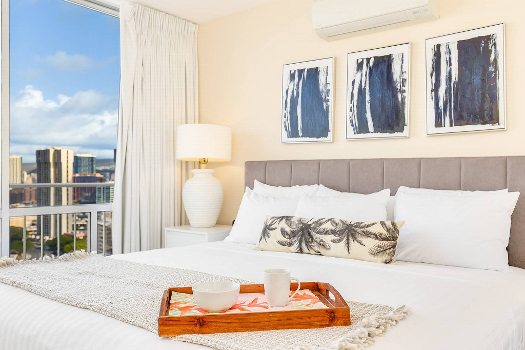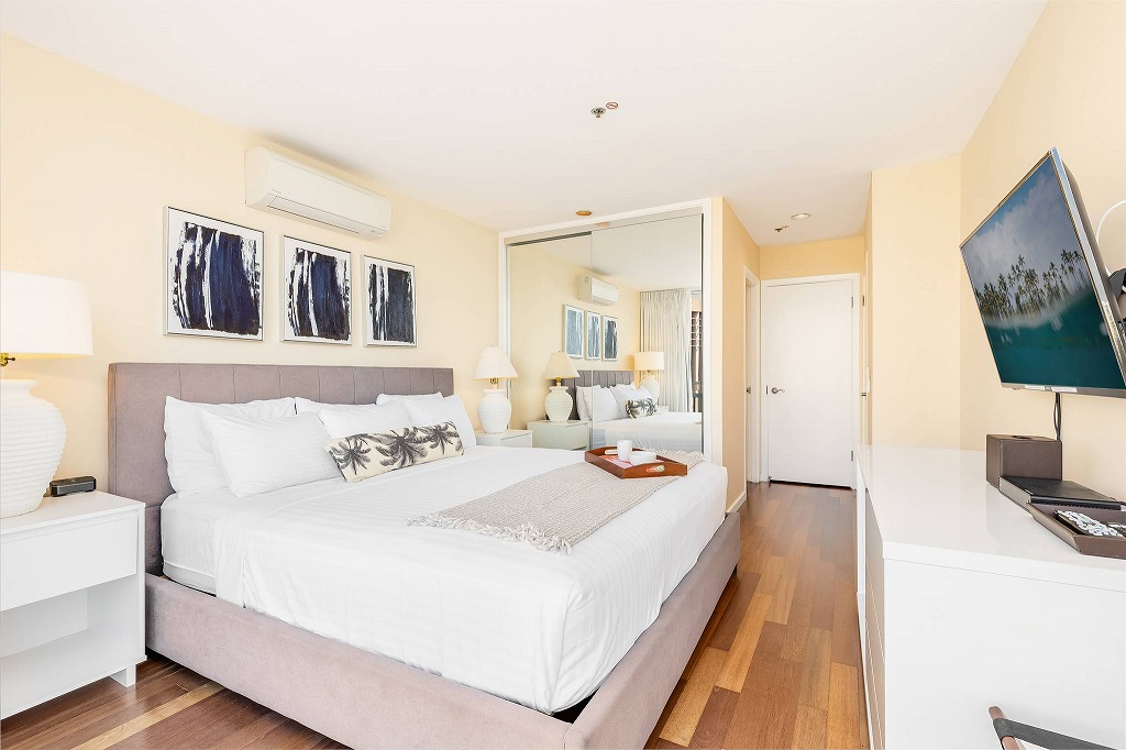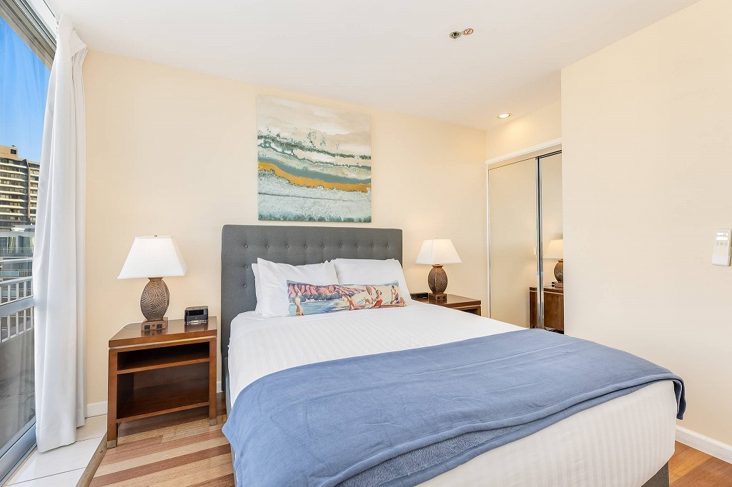 旅慣れた旅行者も魅了し続けるワイキキの中心部とビーチ、ショッピングスポットとして外せないアラモアナ・ショッピングセンターそれぞれの中間に位置し、いずれも徒歩圏内というアクセスの良さも、長年人気を支え続けている魅力のひとつです。アクティブに動き回った後は、部屋で穏やかに過ごしたい、という希望を叶えてくれるユニットです。ラナイに出れば、太平洋の壮大な空気を肌に感じ、日が落ちる頃には美しい夕日を眺めることができるでしょう。なお、毎日のメイドサービス、タオル・リネン類の交換は行っていません。