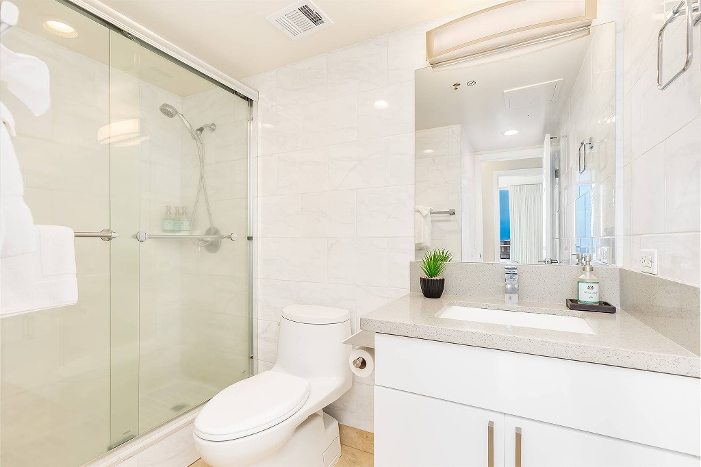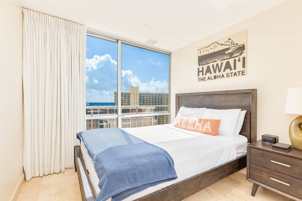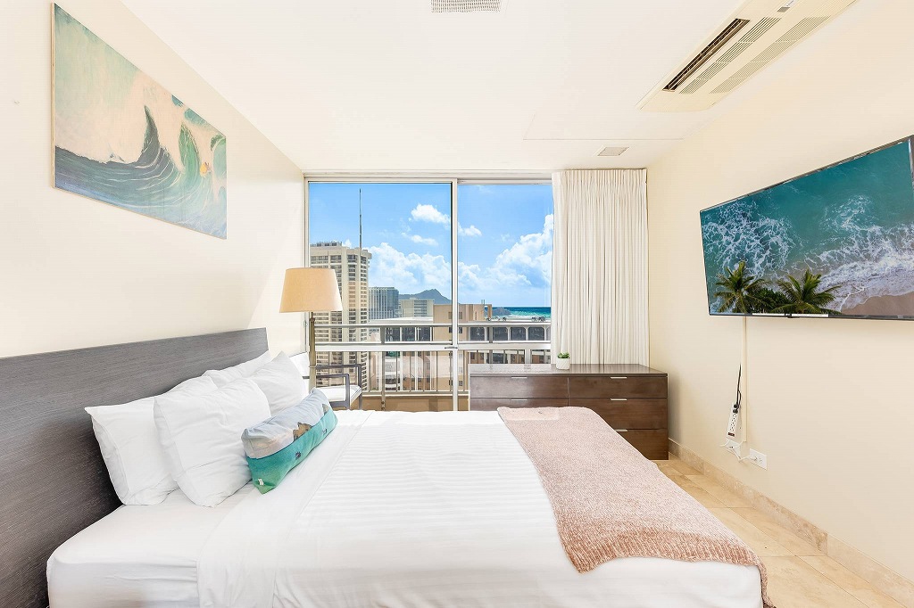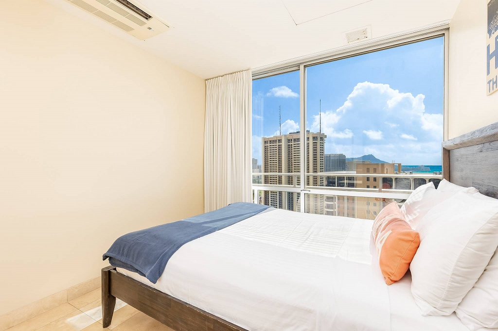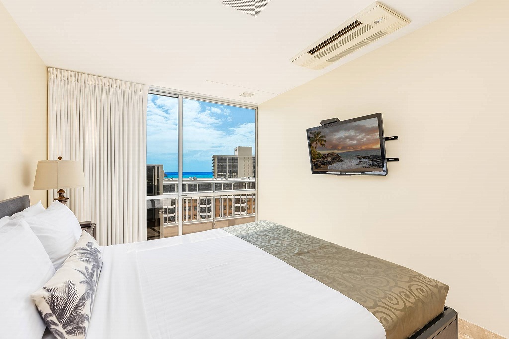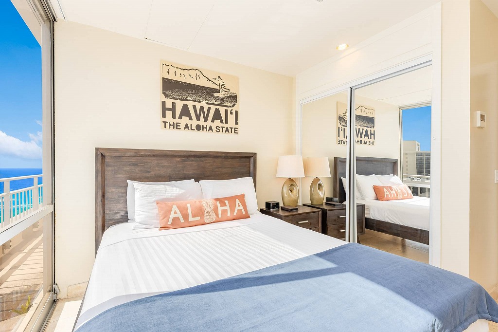 ワイキキの象徴的コンドミニアム、ビーチとヨットハーバーを望む抜群の立地のオーシャンフロントに建つイリカイ・ホテル。その26階の高層階にあるこの3ベッドルーム・ペントハウスは、最上階の海に向かって突き出た、ヒルトン・ハワイアンヴィレッジ側の角部屋です。ダイヤモンドヘッドとオーシャンビューを望み、毎週金曜日に上がるヒルトンの花火も特等席で鑑賞できます。広々としたリビングとプライベートラナイ、セントラルエアコン、フルキッチン、室内洗濯機・乾燥機を備え、2つのバスルームはハンドシャワー付きと設備も整っています。各ベッドルームには、それぞれキングベッド、クイーンベッド、フル/ダブルベッドが1台ずつの構成となっています。