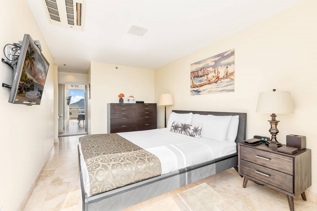 旅慣れた旅行者も魅了し続けるワイキキの中心部とビーチ、ショッピングスポットとして外せないアラモアナ・ショッピングセンターそれぞれの中間に位置し、いずれも徒歩圏内というアクセスの良さも、長年人気を支え続けている魅力のひとつです。アクティブに動き回った後は、部屋で穏やかに過ごしたい、という希望を叶えてくれるユニットです。ラナイに出れば、太平洋の壮大な空気を肌に感じ、日が落ちる頃には美しい夕日を眺めることができるでしょう。なお、毎日のメイドサービス、タオル・リネン類の交換は行っていません。