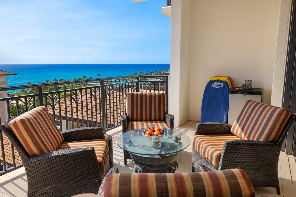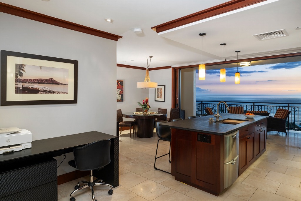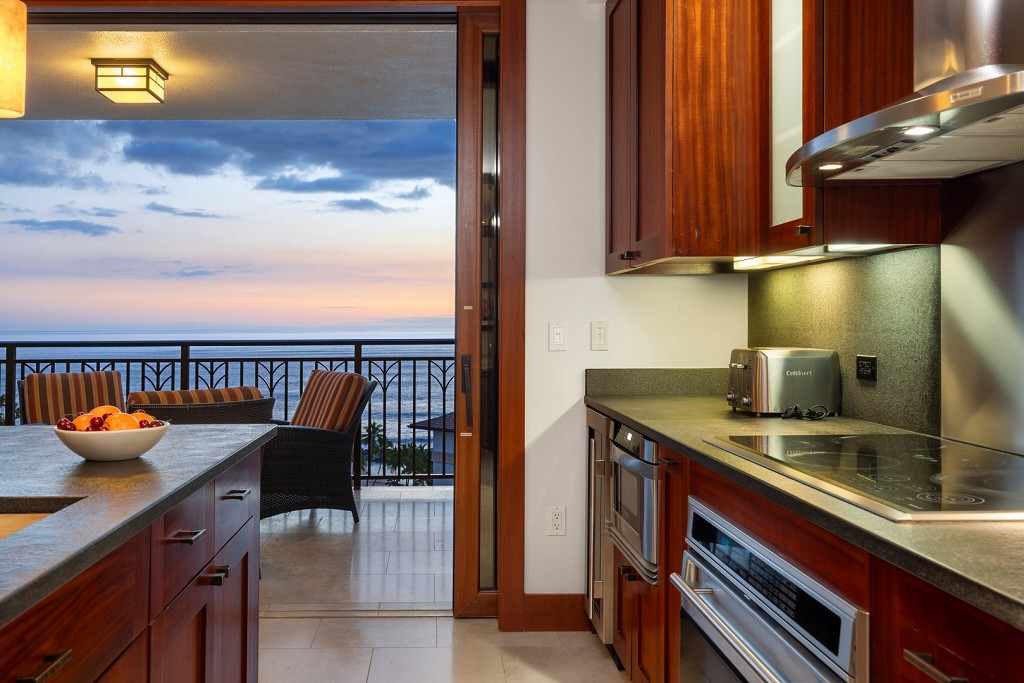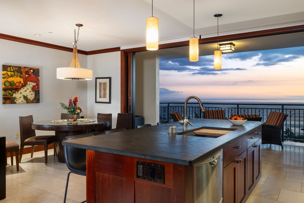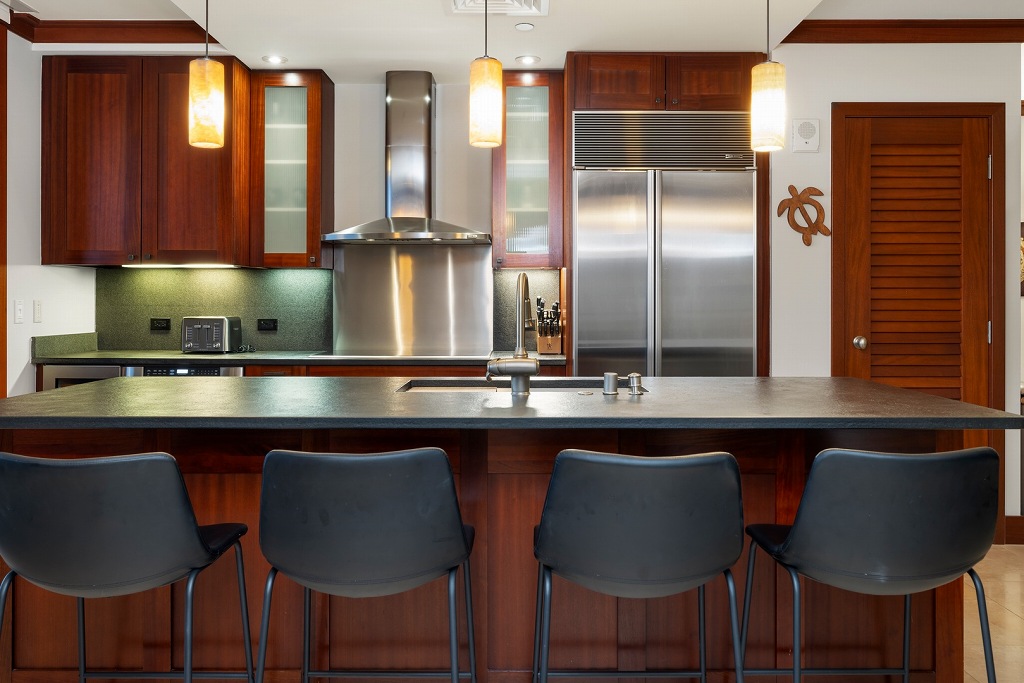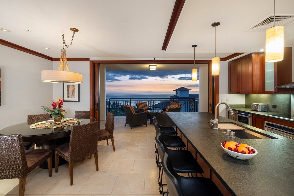 上質なレザーのシートと特注のキルトワークで飾られたリビングルームは、スタイリッシュさと居心地の良さが完璧に融合した空間。前方に広がる穏やかな太平洋のパノラマビューが、静寂の世界へと誘います。リビングルームからアクセスできる広々としたラナイでは、朝のコーヒーでくつろいだり、太平洋に沈む息を呑むような夕日を眺めたりと、至福のひとときを過ごせるでしょう。このペントハウスは、ハワイでの忘れられない休暇を過ごすのに理想的な隠れ家となるはずです。ヴィラの設備の整ったキッチンには、高級家電、調理器具、ワインセラーが揃い、あらゆる料理のニーズに応えてくれます。カジュアルな朝食からエレガントなディナーまで、便利さとスタイリッシュさを兼ね備えた空間となっています。