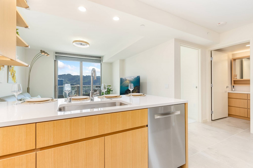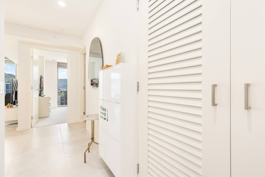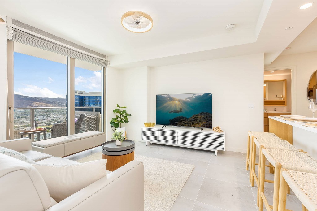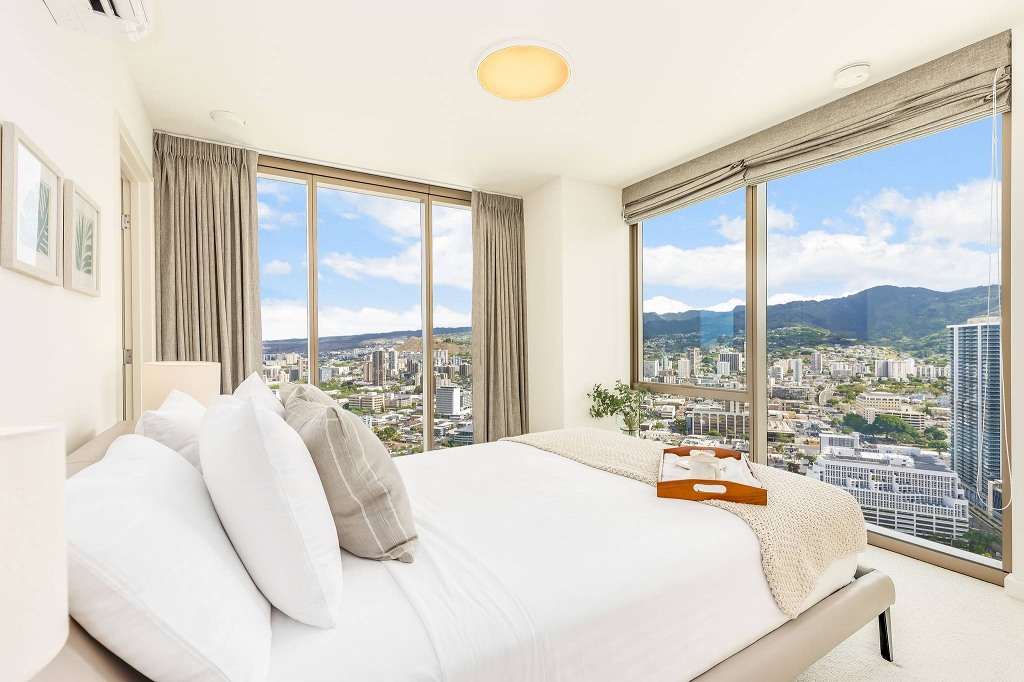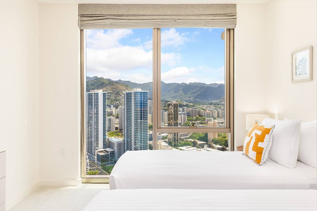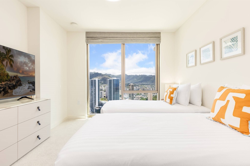 高層階40階のこのユニットは、白を基調とした落ち着いたカラーのインテリアが特徴です。シティー、マウンテンビューの大きな窓から自然光が差し込み、リビングを心地よい明るさで包み込んでくれます。そこから眺める景色を背景に、ゆったりとした時間をお楽しみください。各ベッドルームからも、ホノルルと西オアフ島に広がる街と山々のパノラマビューを一望できます。夜にはほんのり優しい光の夜景がその魅力を一層引き立ててくれるでしょう。マスターベッドルームにはキングベッド、クローゼット、ウォークインシャワーの専有バスルームが備わり、ゲストベッドルームにはツインベッドとクローゼット、廊下のバスルームにはバスタブのある間取りとなっています。また、設備の揃ったキッチンに加え、室内に洗濯機と乾燥機があり、長期滞在でも不自由なく生活することができます。