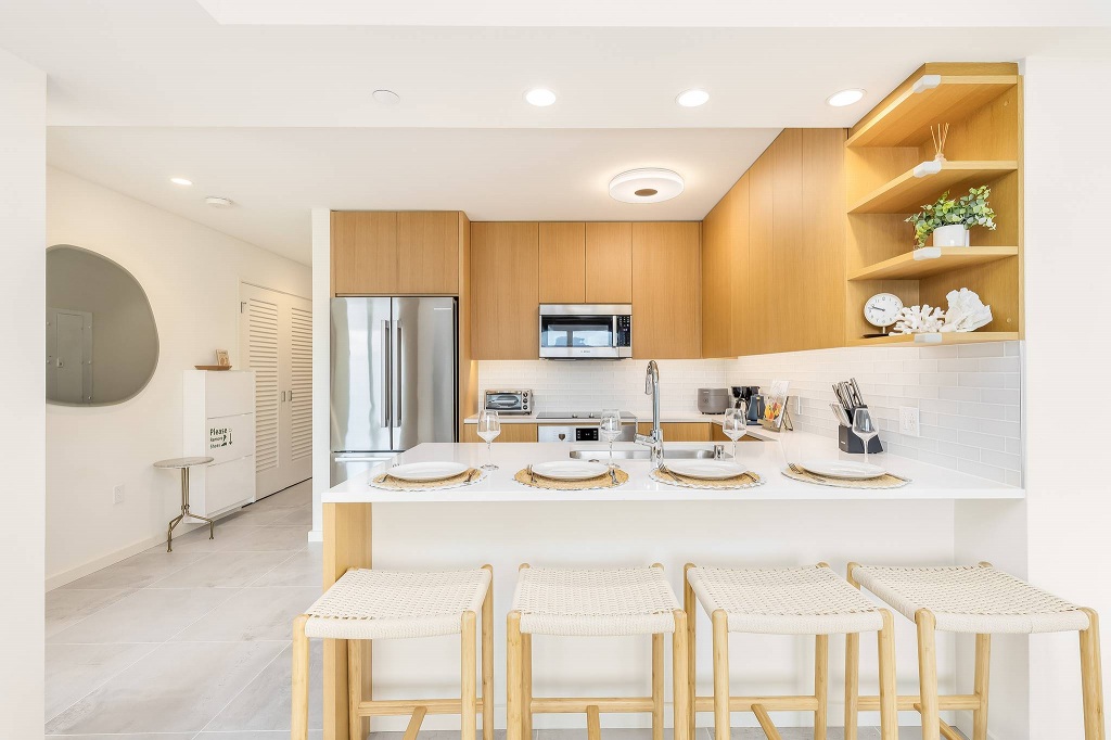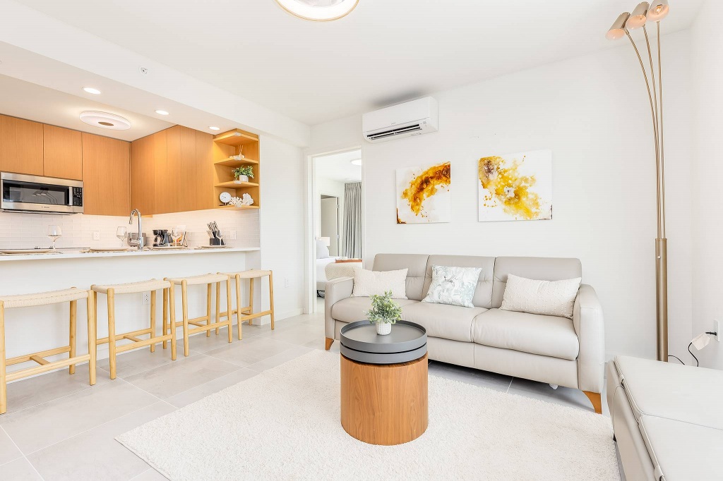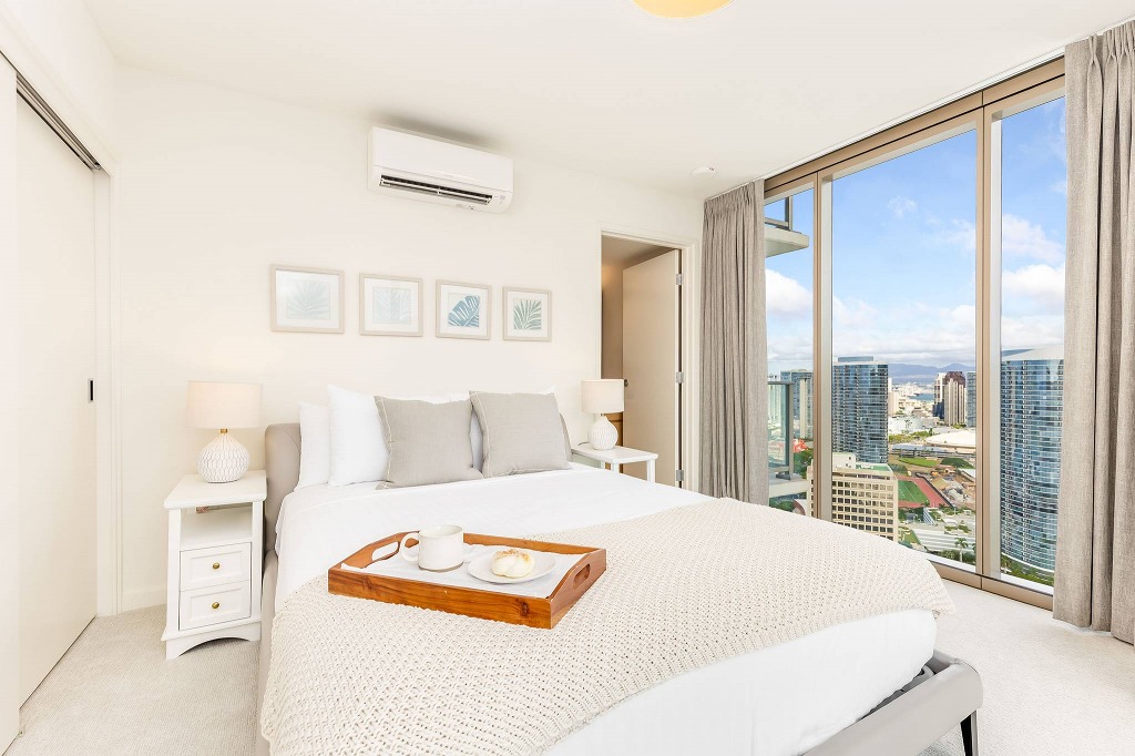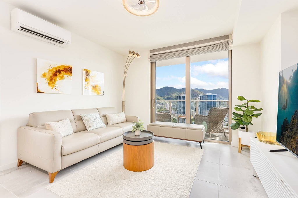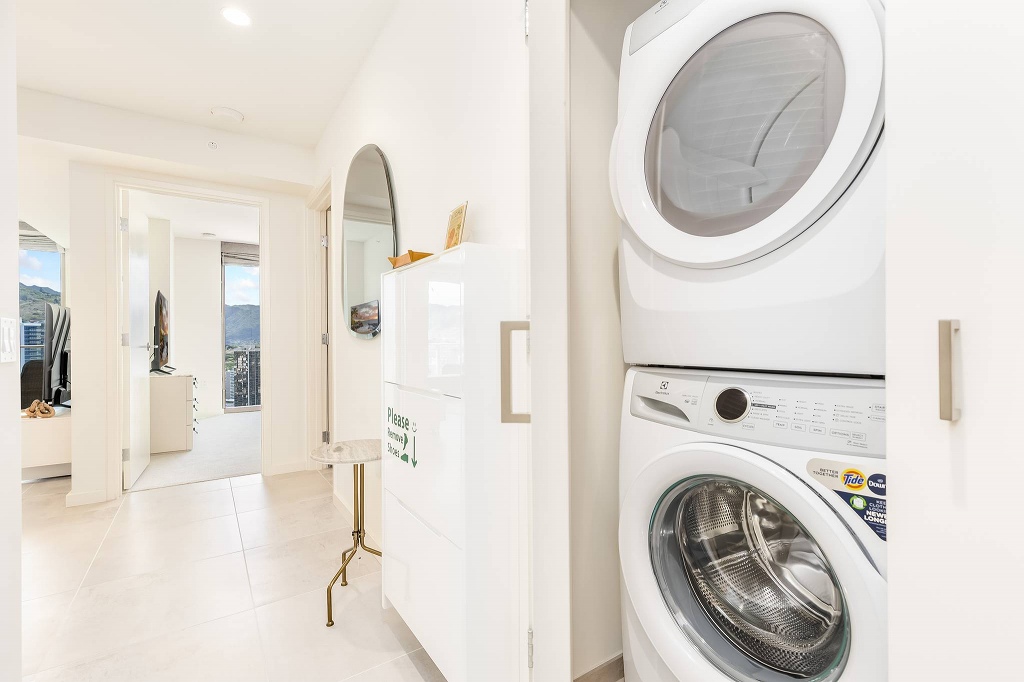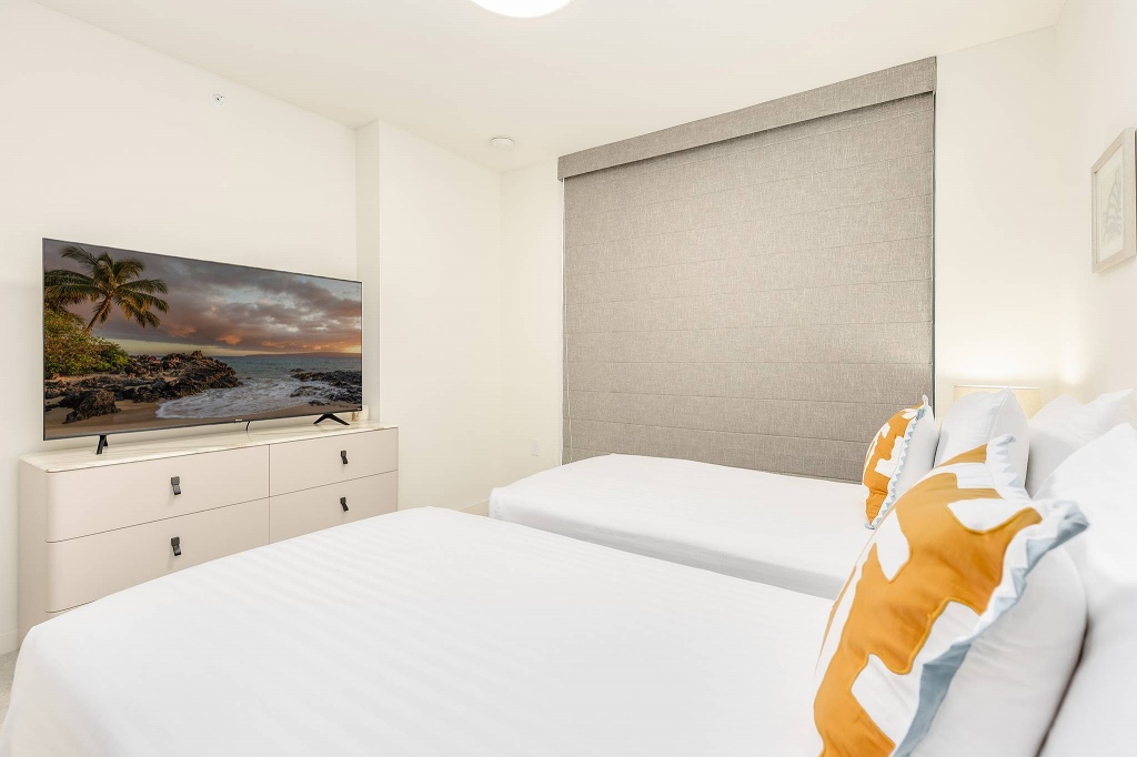 高層階40階のこのユニットは、白を基調とした落ち着いたカラーのインテリアが特徴です。シティー、マウンテンビューの大きな窓から自然光が差し込み、リビングを心地よい明るさで包み込んでくれます。そこから眺める景色を背景に、ゆったりとした時間をお楽しみください。各ベッドルームからも、ホノルルと西オアフ島に広がる街と山々のパノラマビューを一望できます。夜にはほんのり優しい光の夜景がその魅力を一層引き立ててくれるでしょう。マスターベッドルームにはキングベッド、クローゼット、ウォークインシャワーの専有バスルームが備わり、ゲストベッドルームにはツインベッドとクローゼット、廊下のバスルームにはバスタブのある間取りとなっています。また、設備の揃ったキッチンに加え、室内に洗濯機と乾燥機があり、長期滞在でも不自由なく生活することができます。