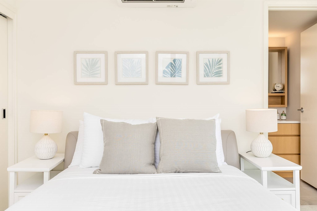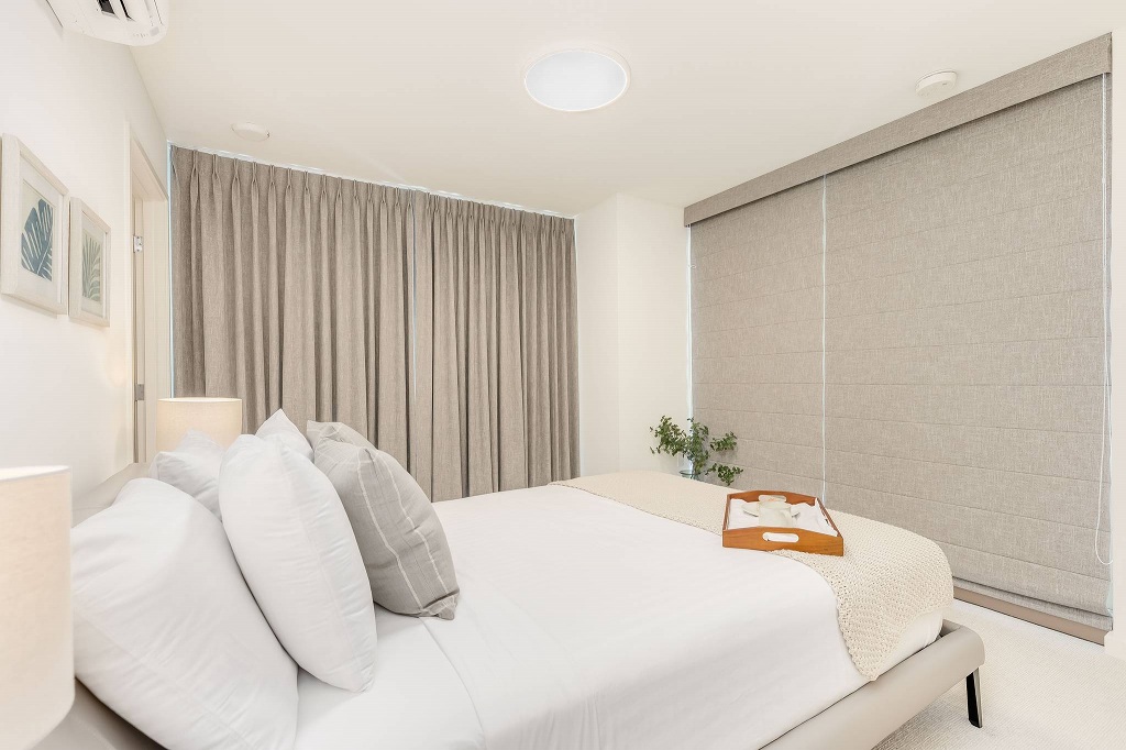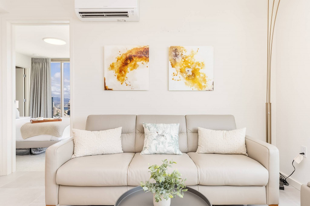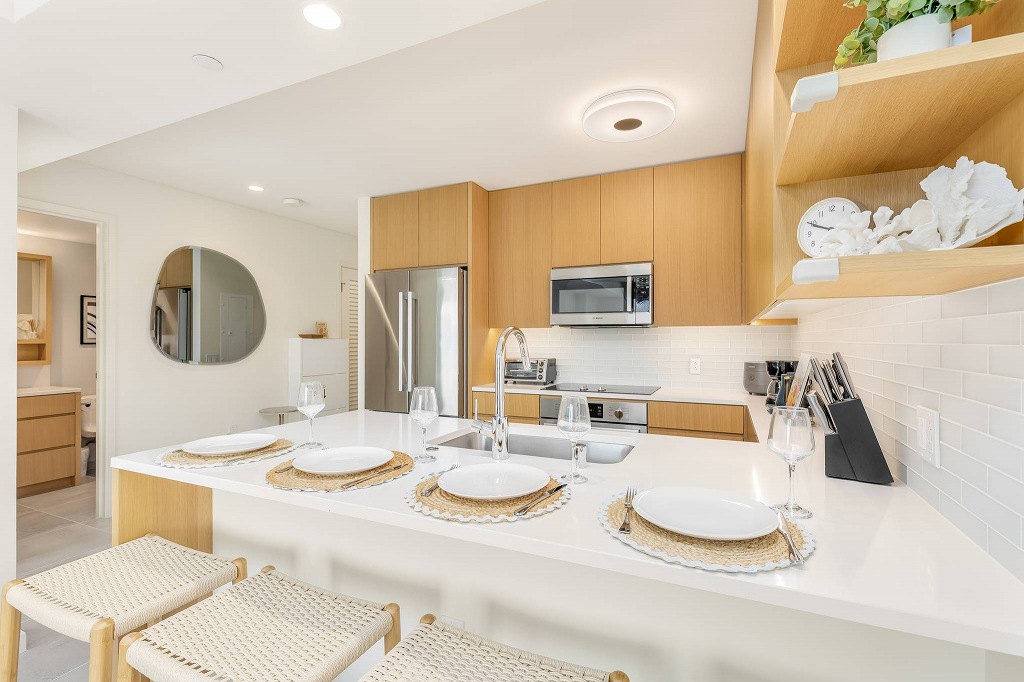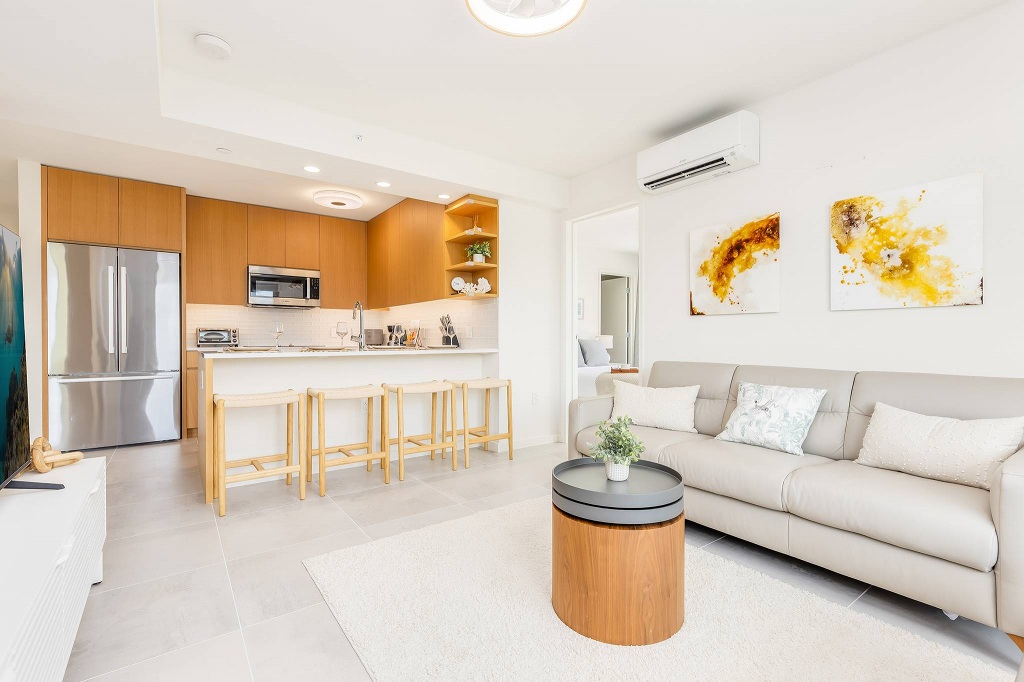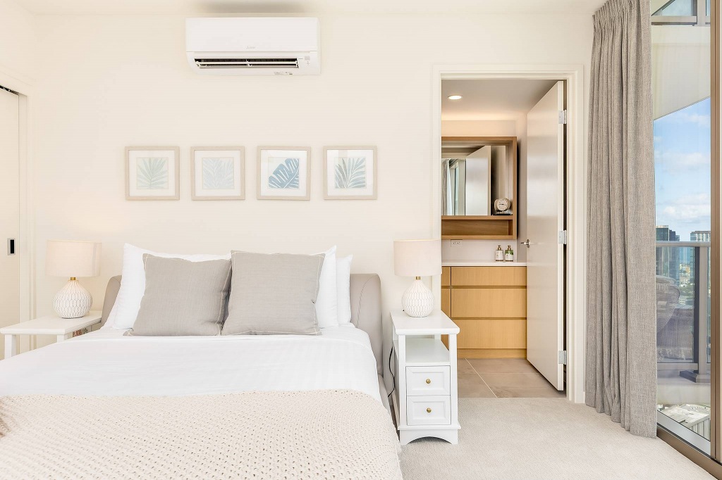 高層階40階のこのユニットは、白を基調とした落ち着いたカラーのインテリアが特徴です。シティー、マウンテンビューの大きな窓から自然光が差し込み、リビングを心地よい明るさで包み込んでくれます。そこから眺める景色を背景に、ゆったりとした時間をお楽しみください。各ベッドルームからも、ホノルルと西オアフ島に広がる街と山々のパノラマビューを一望できます。夜にはほんのり優しい光の夜景がその魅力を一層引き立ててくれるでしょう。マスターベッドルームにはキングベッド、クローゼット、ウォークインシャワーの専有バスルームが備わり、ゲストベッドルームにはツインベッドとクローゼット、廊下のバスルームにはバスタブのある間取りとなっています。また、設備の揃ったキッチンに加え、室内に洗濯機と乾燥機があり、長期滞在でも不自由なく生活することができます。