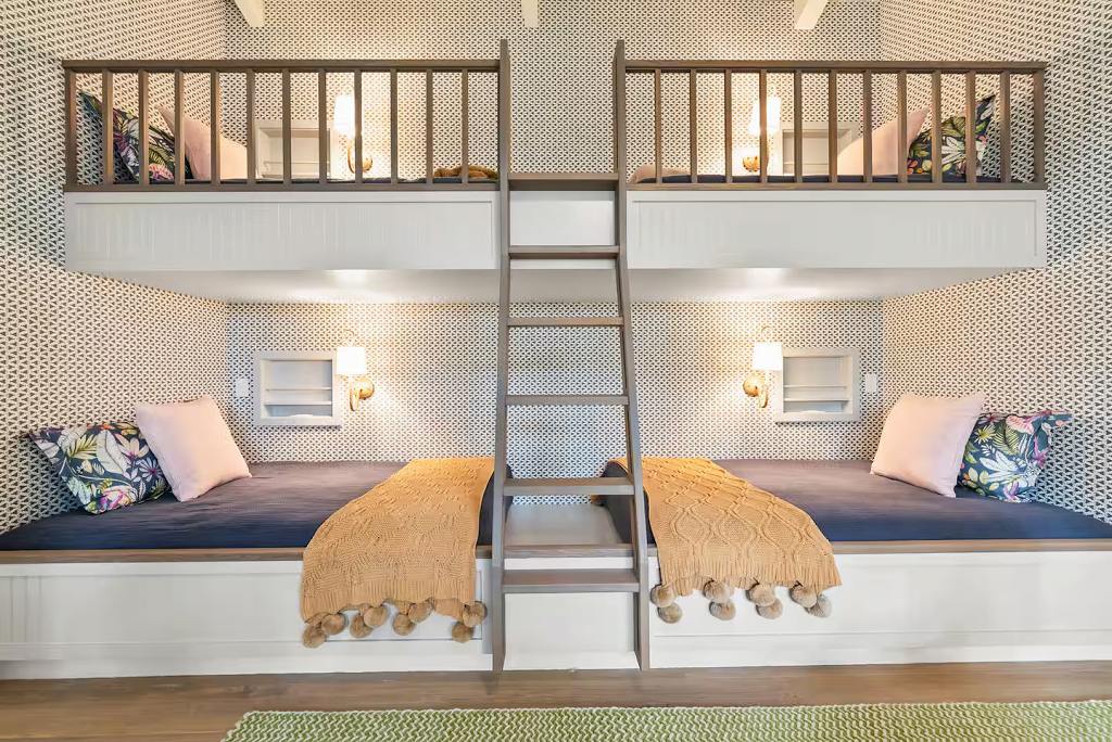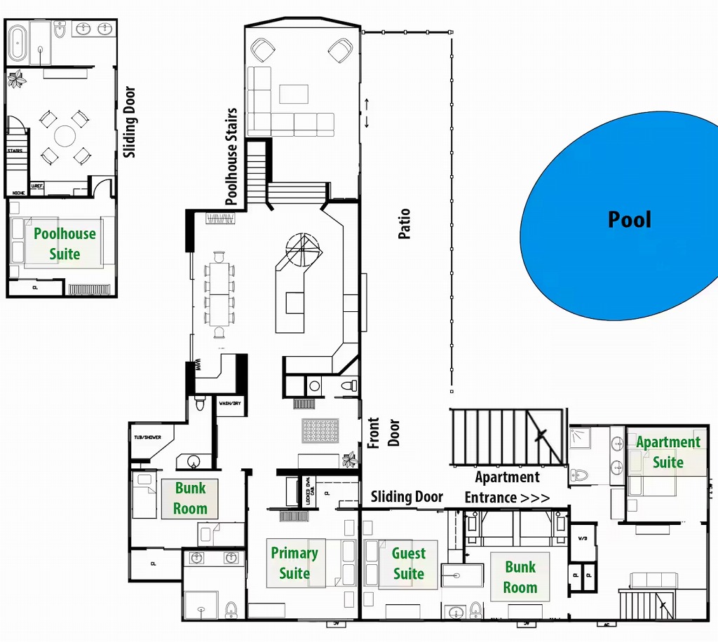 メインハウスには3つのベッドルームがあり、1階のプールスイートはプライベートラウンジとバスタブ付きのバスルームを備え、最もプライベートな空間となっています。プールサイドからスライディングドアでアクセスすることもできます。2階にはメインスイートと、二段ベッド2台のバンクルームがあり、どちらも専用バスルームを備えています。ツリーハウス(ゲストハウス)のベッドルームは全て2階にあり、リビングルームはメインスイートとそのバスルームとひとつの空間となっていますが、二段ベッド2台のあるバンクルームからもアクセスが可能となっています。ゲストスイートはパティオからスライディングドアでアクセスでき、バスルームはバンクルームと共有する間取りとなっています。